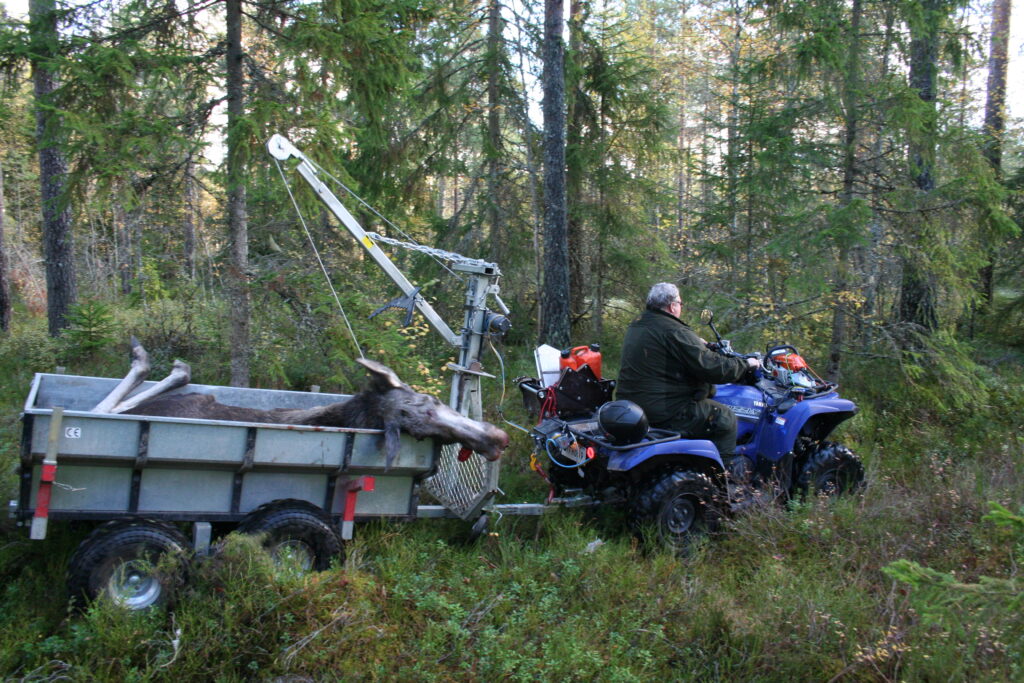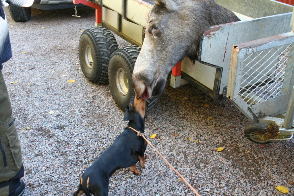 Die Jagd in Schweden war wieder erfolgreich. links oben: Unser Freund Hans-Olof bei der Bergung einer Elchkuh. links unten: Svenja ist begeistert von der Jagdbeute. rechts: Hexe (Unja) ist abgekämpft von der kräftezehrenden Damwildjagd.