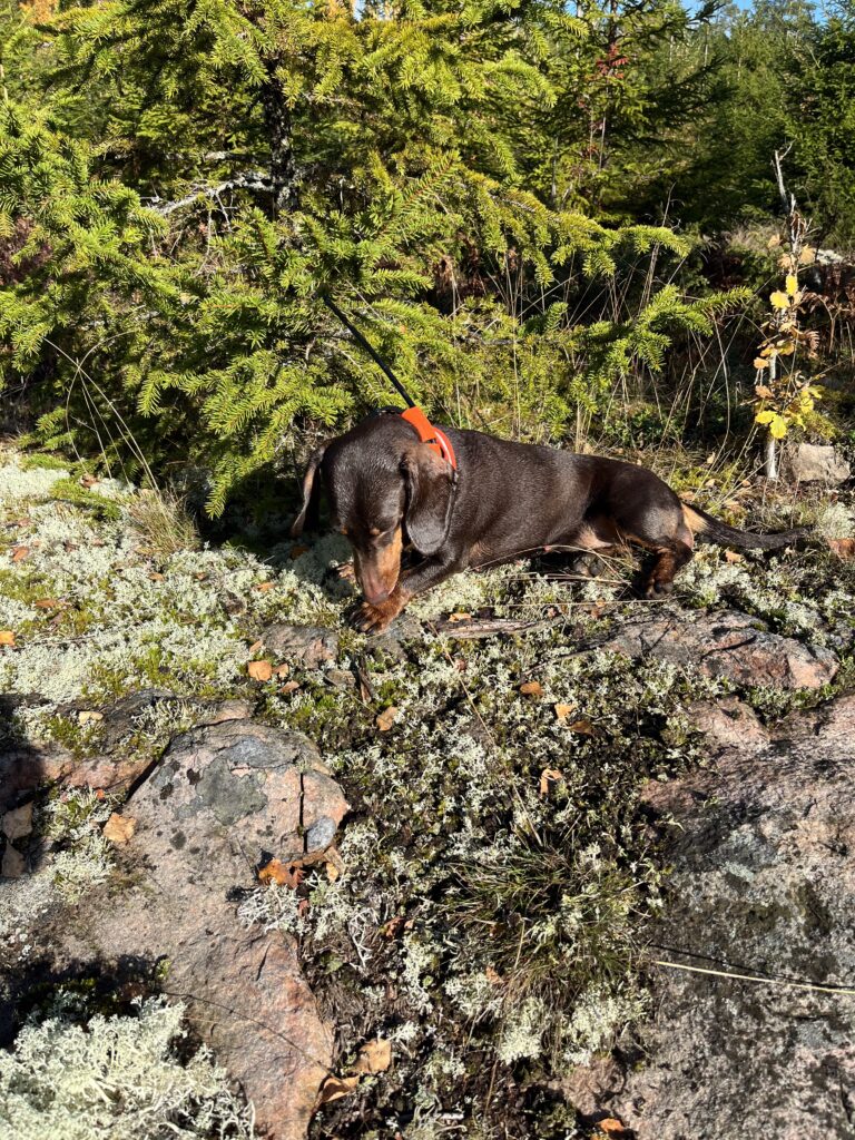 links: Unsere Ronja nach erfolgreicher Nachsuche; die Temperatur betrug hier noch fast 30 Grad. Mitte: Kurz , aber erfolgreich! Auch derart unspektakuläre Totsuchen sind für jeden Jagdteckel wichtige Erfolgserlebnisse.